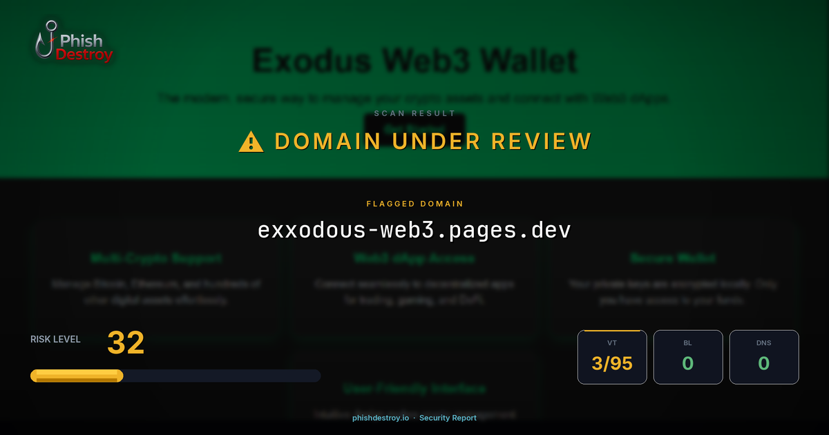 The domain exxodous-web3[.]pages[.]dev has been identified as a cryptocurrency phishing website. This malicious site targets Web3 users by mimicking legitimate crypto platforms to steal wallet credentials and digital assets.