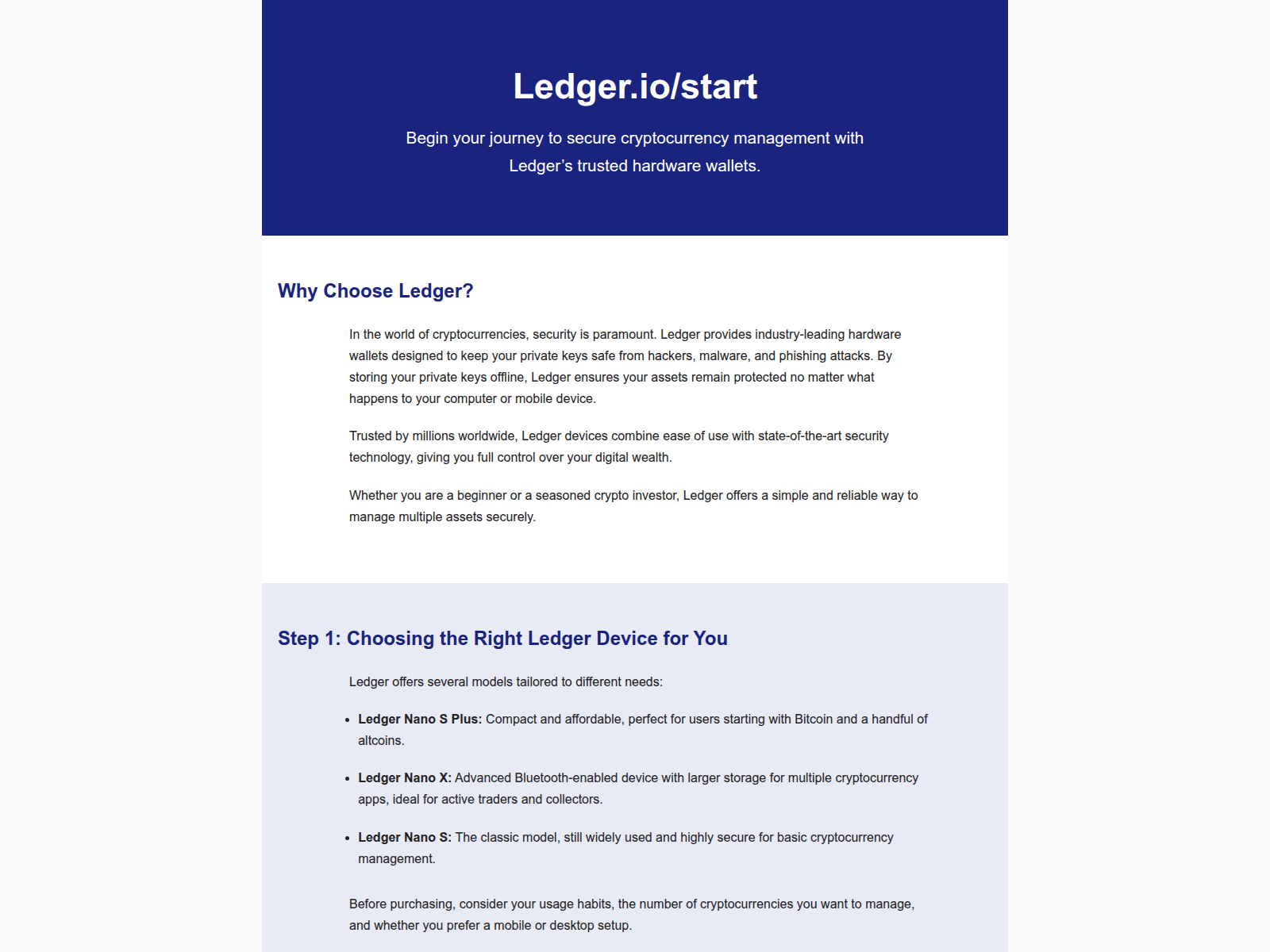 The site displays a page titled “Ledger.io/start | Your Secure Crypto Device”, which may be designed to impersonate Ledger.