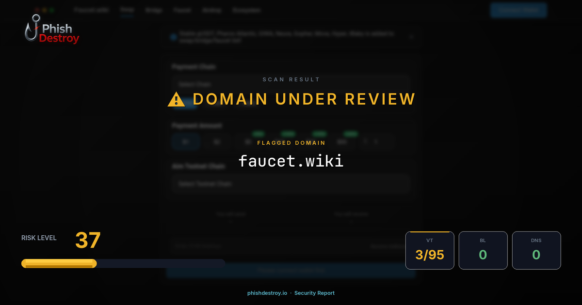 This domain security report for faucet.wiki is maintained by PhishDestroy's automated threat intelligence pipeline. Our system continuously monitors this domain across 3 security vendors on VirusTotal, 1 public blocklists.