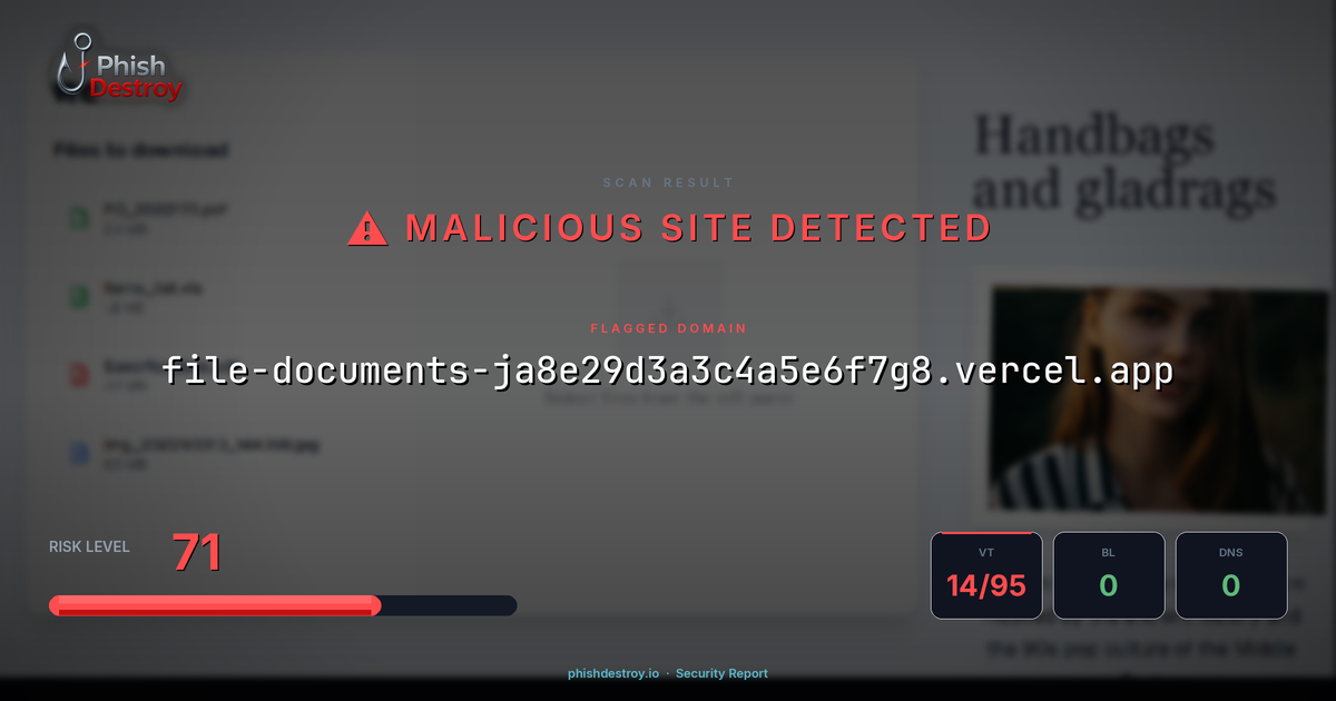 file-documents-ja8e29d3a3c4a5e6f7g8.vercel.app has been flagged by 14 security vendors as of March 16, 2026.