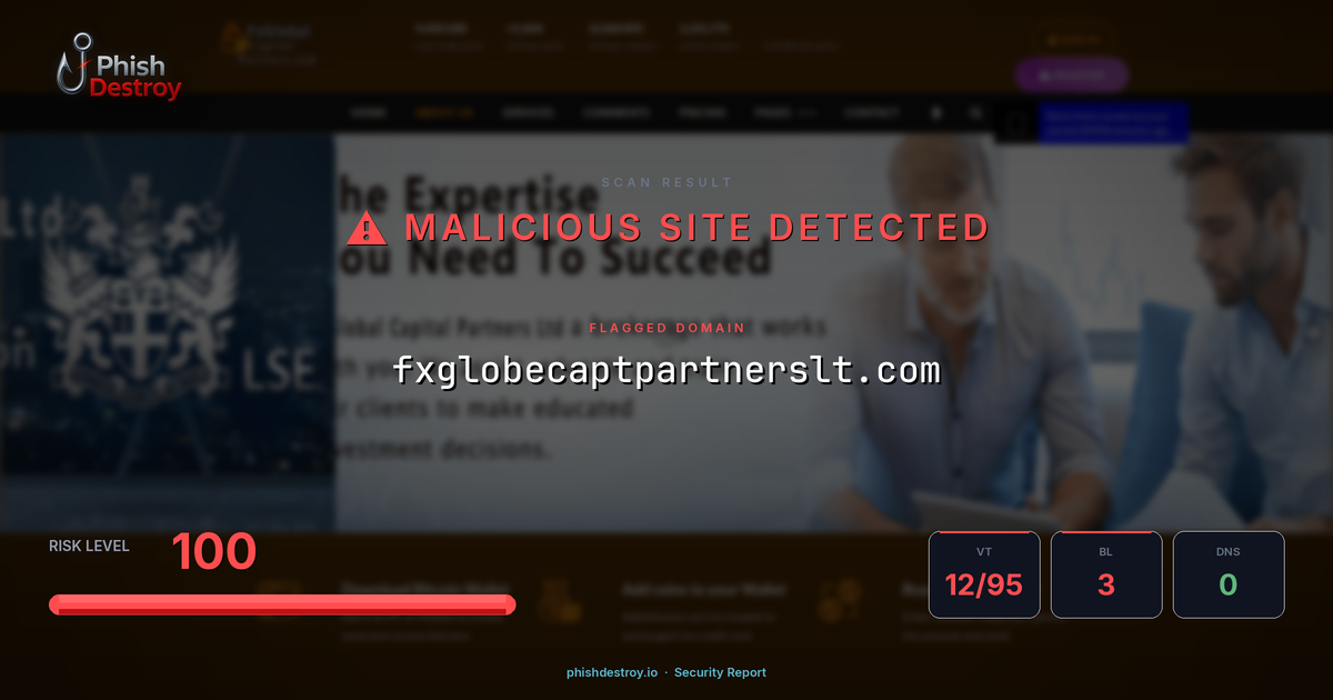 This domain security report for fxglobecaptpartnerslt.com is maintained by PhishDestroy's automated threat intelligence pipeline. Our system continuously monitors this domain across 12 security vendors on VirusTotal, 3 public blocklists.