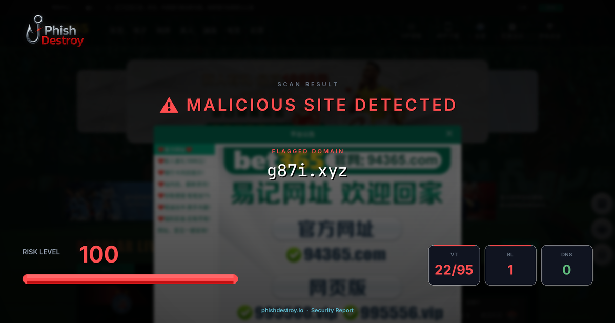This domain security report for g87i.xyz is maintained by PhishDestroy's automated threat intelligence pipeline. Our system continuously monitors this domain across 22 security vendors on VirusTotal, 1 public blocklists.