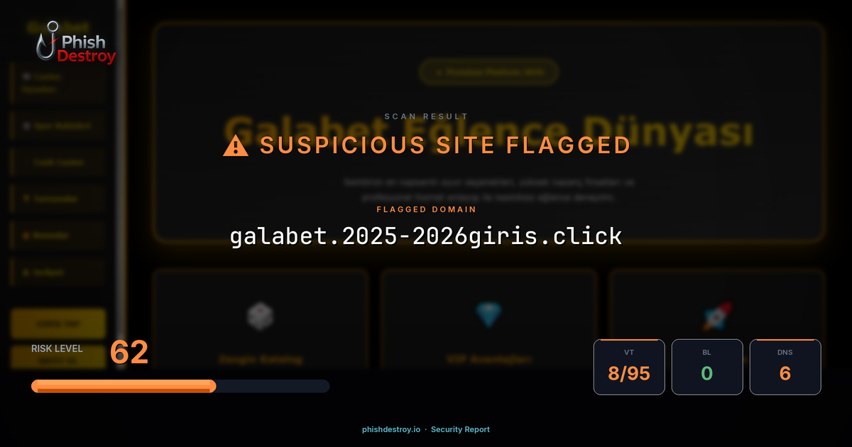 This domain security report for galabet.2025-2026giris.click is maintained by PhishDestroy's automated threat intelligence pipeline. Our system continuously monitors this domain across 8 security vendors on VirusTotal, 1 public blocklists.