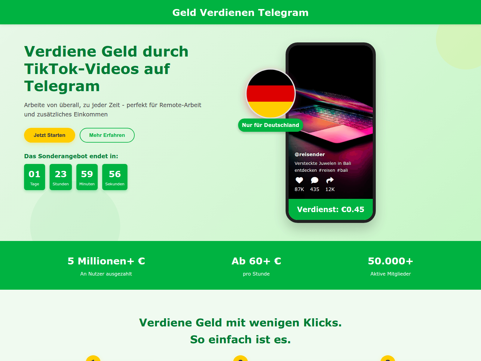 The site displays a page titled “Geld Verdienen Telegram - Verdiene Geld durch TikTok-Videos”.