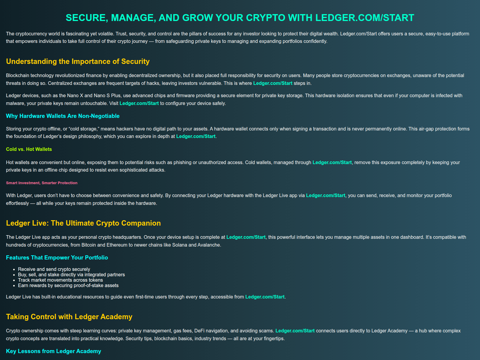 The site displays a page titled “Secure, Manage, and Grow Your Crypto with Ledger.com/Start”, which may be designed to impersonate Ledger.