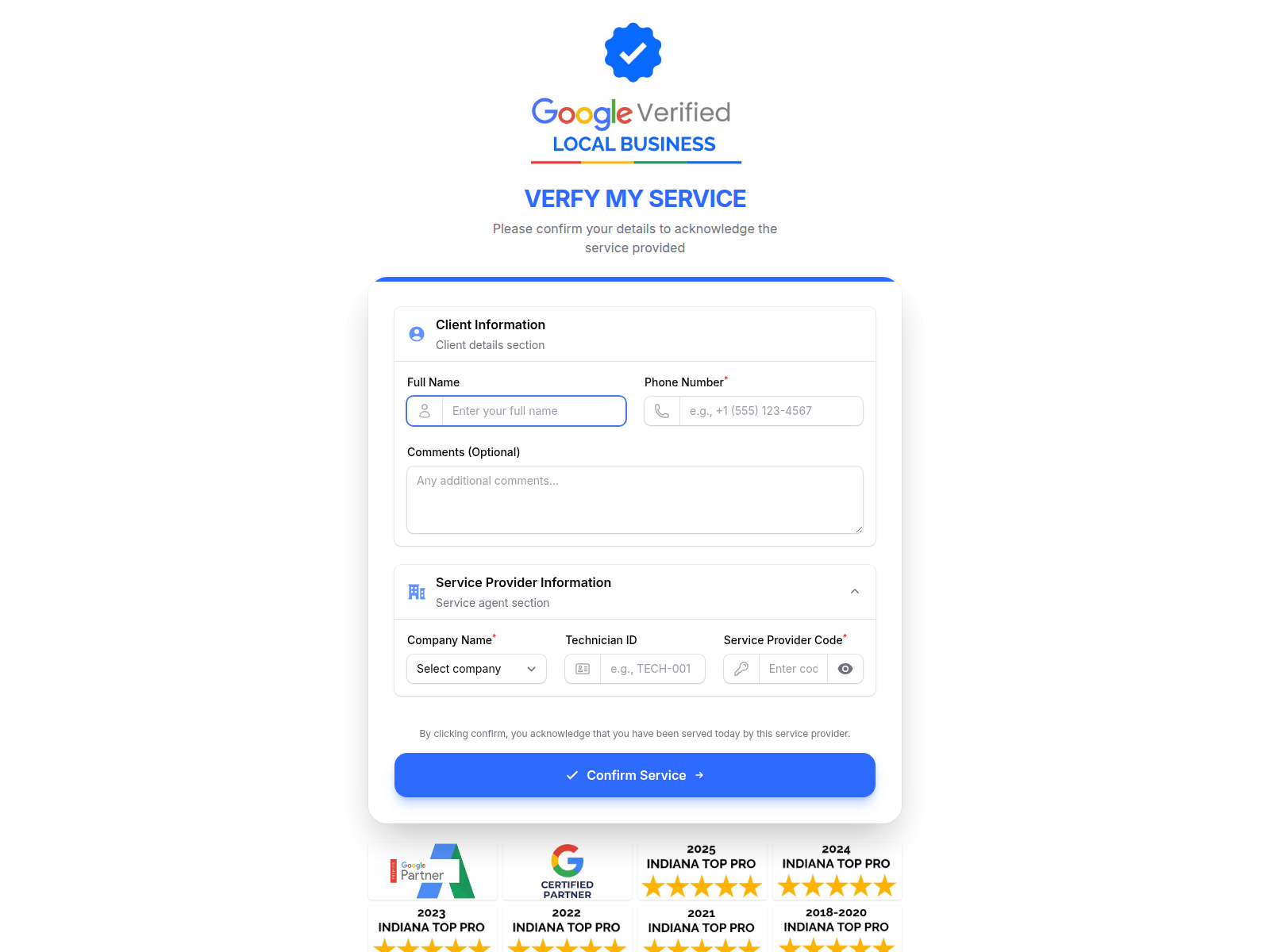 The site displays a page titled “Service Confirmation”, which may be designed to impersonate Google.