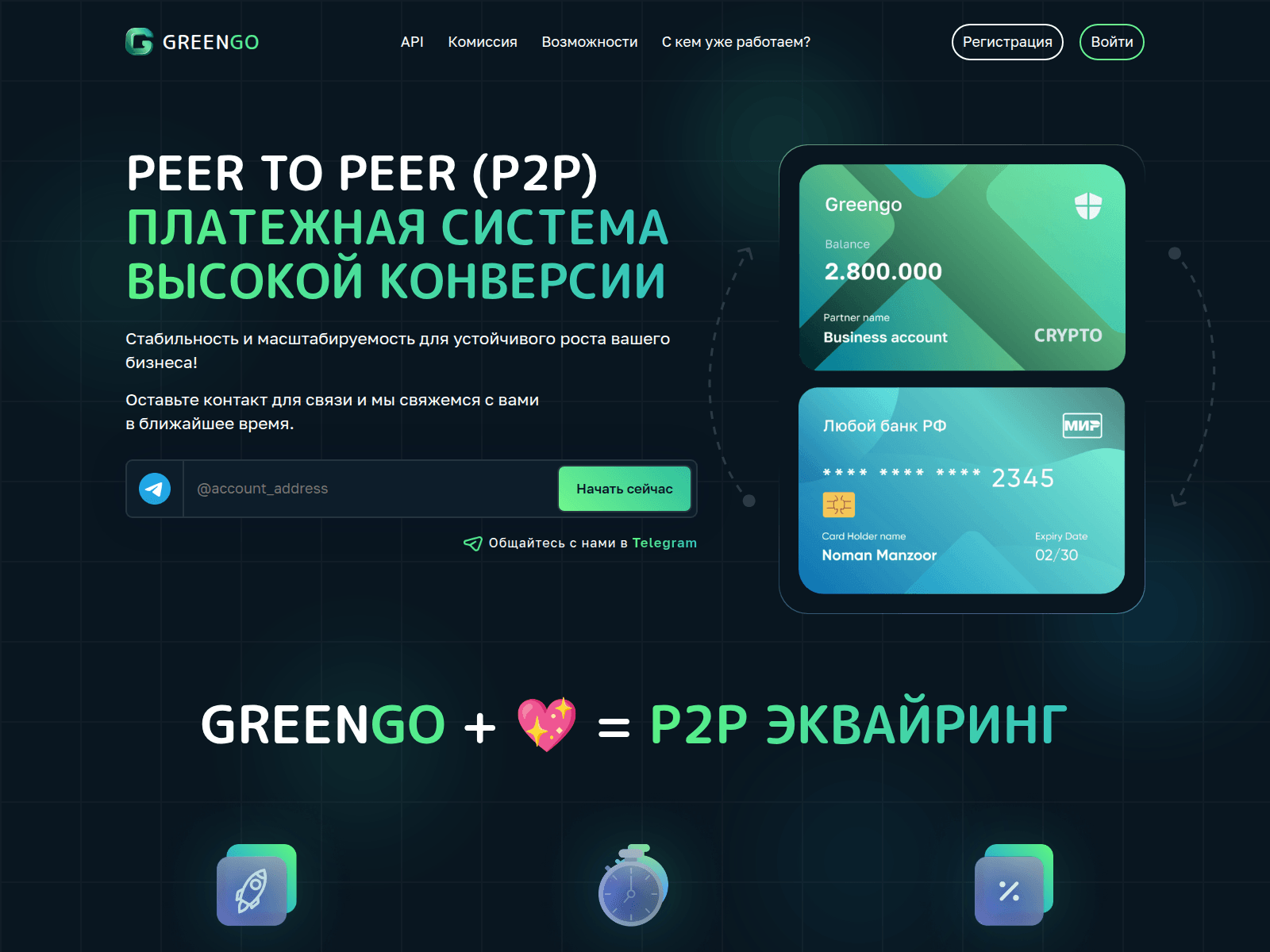 The site displays a page titled “P2P платежная система с высокой конверсией | Greengo”.