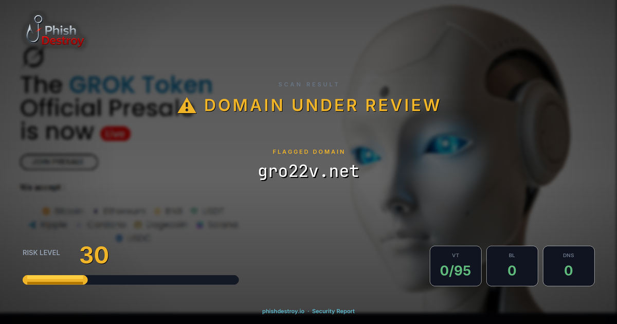 gro22v.net has been listed on PhishDestroy as a suspicious domain. Scanned by 95 security vendors — automated detections may take time to update. PhishDestroy threat analysts continue to monitor this domain.