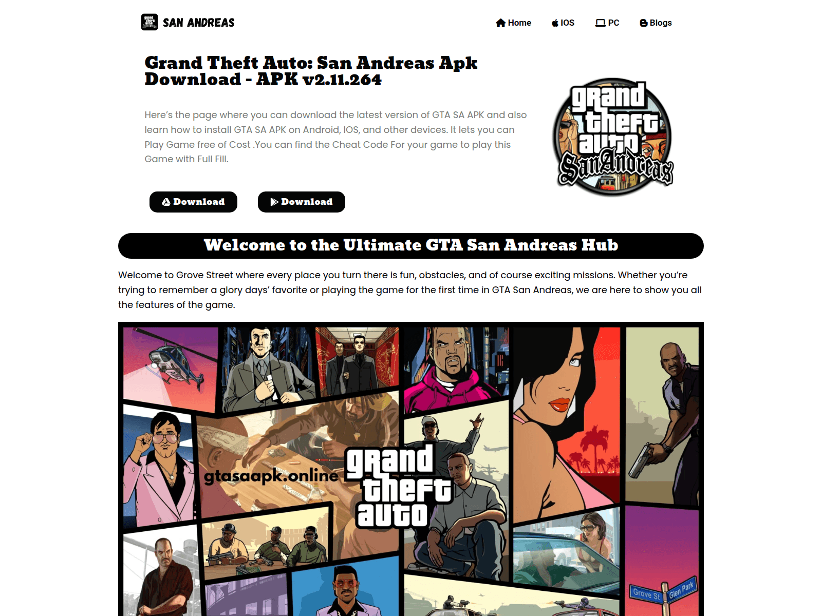 The site displays a page titled “GTA SA APK Download - Your Ultimate San Andreas Experience”.