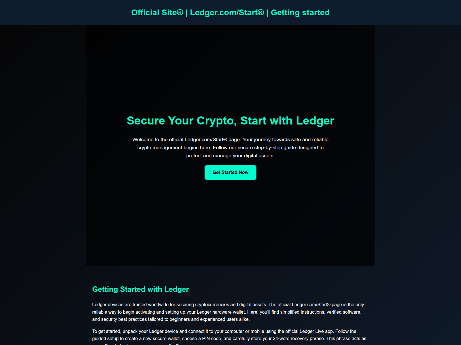 The site displays a page titled “Official Site® | Ledger.com/Start® | Getting started”.