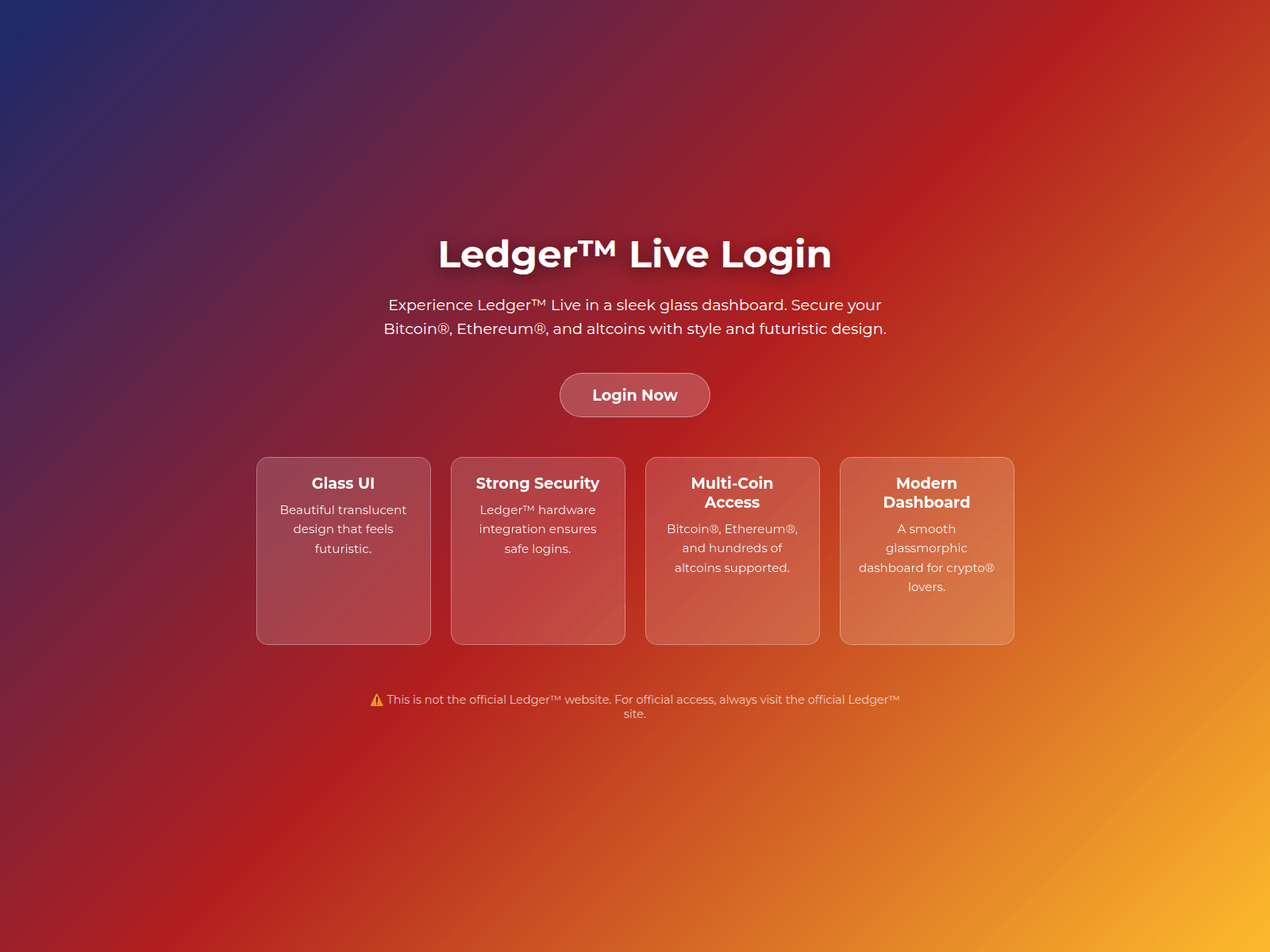 The site displays a page titled “Ledger™ Live Login – Sleek Glass Dashboard”, which may be designed to impersonate Ledger.