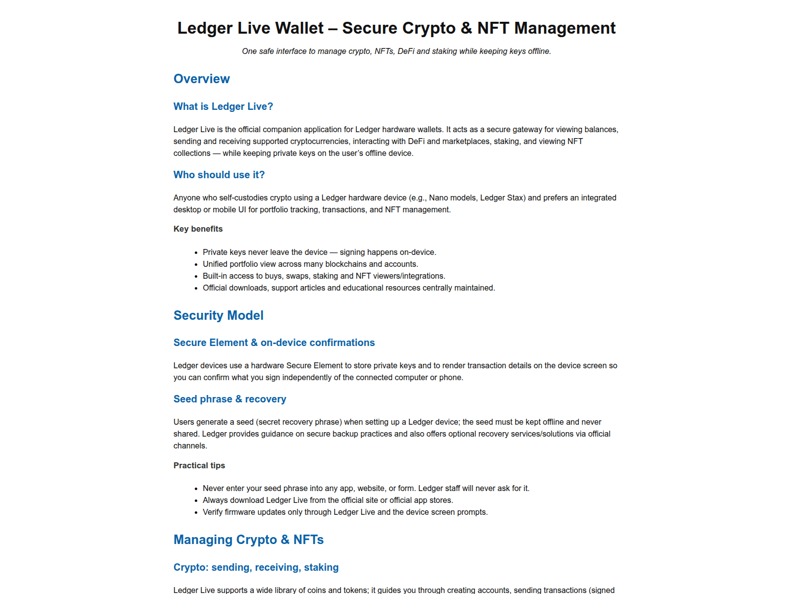 - Use a hardware wallet (Ledger, Trezor). Never store large amounts in browser wallets