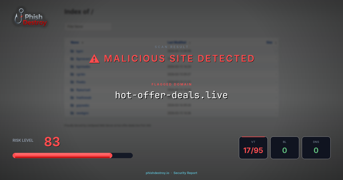 This domain security report for hot-offer-deals.live is maintained by PhishDestroy's automated threat intelligence pipeline. Our system continuously monitors this domain across 17 security vendors on VirusTotal, 1 public blocklists.
