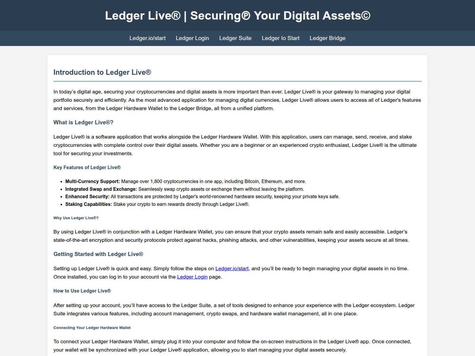 The site displays a page titled “Ledger Live® | Securing℗ Your Digital Assets©”.