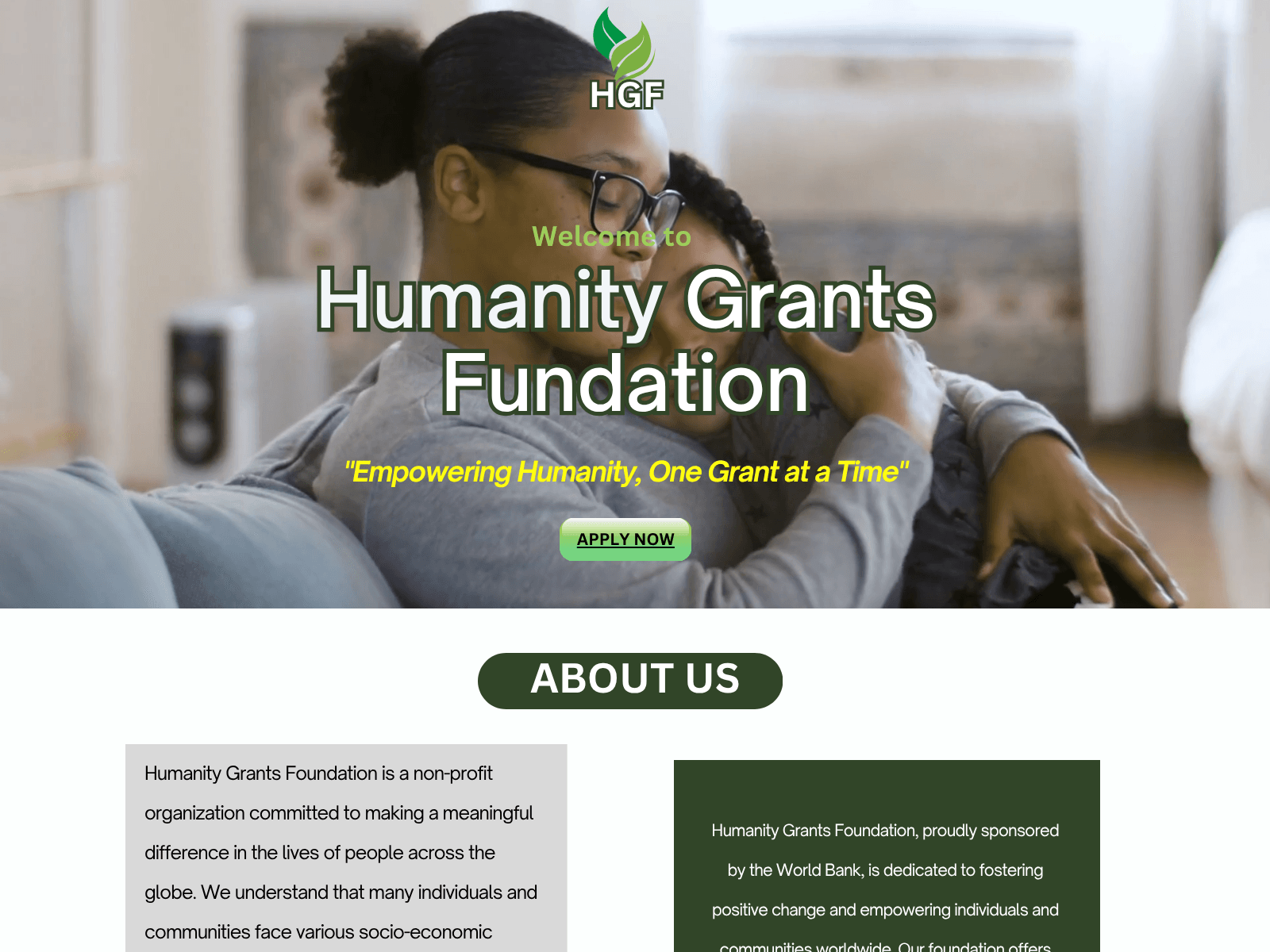 The site displays a page titled “Humanity Grants Foundation”, which may be designed to impersonate across.