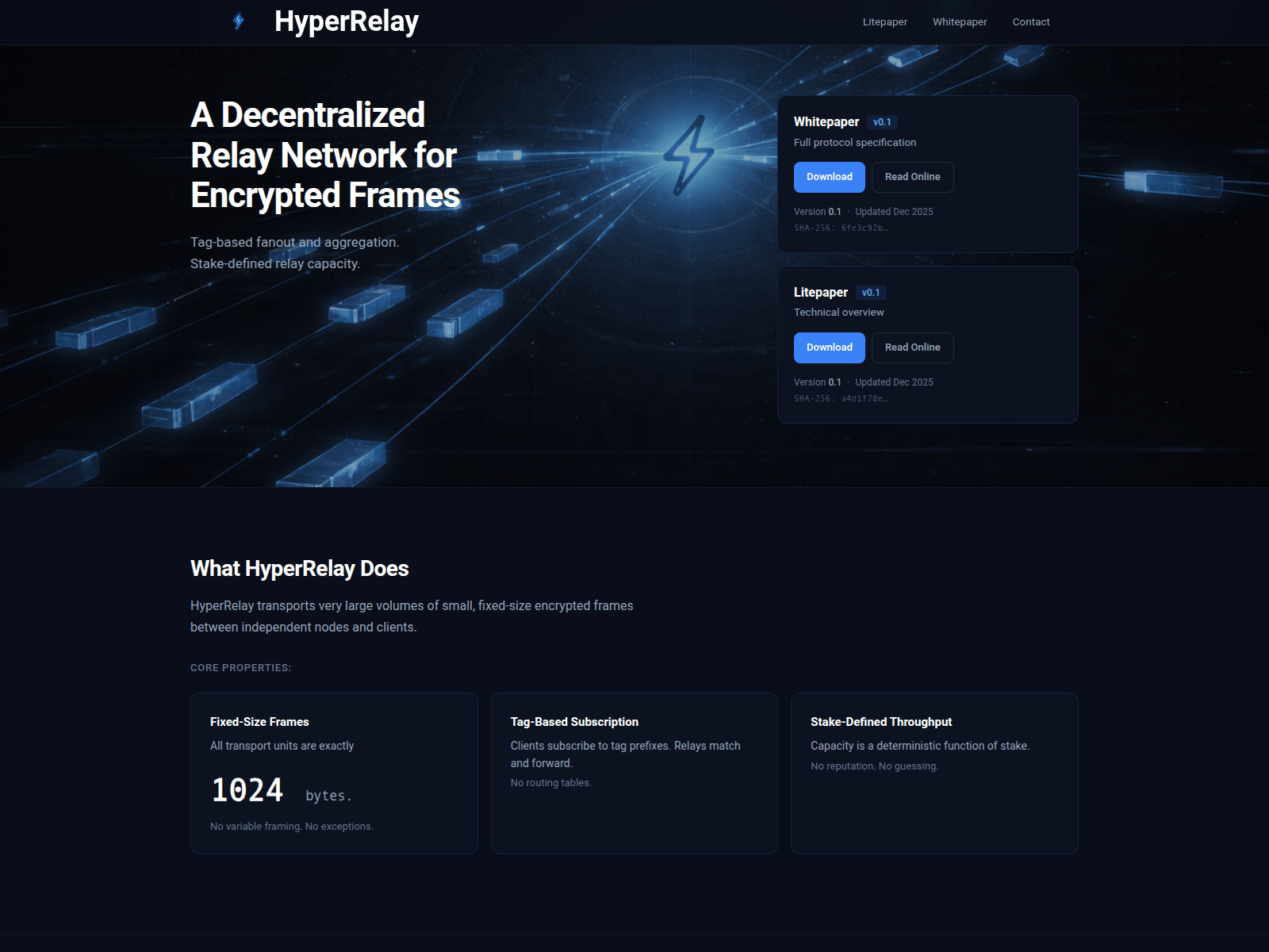 The site displays a page titled “HyperRelay — A Decentralized Relay Network for Encrypted Frames”.