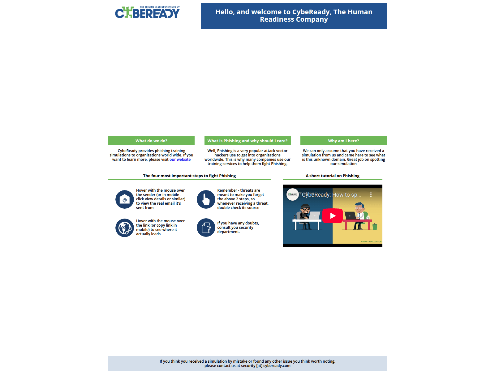 The site displays a page titled “CybeReady”.