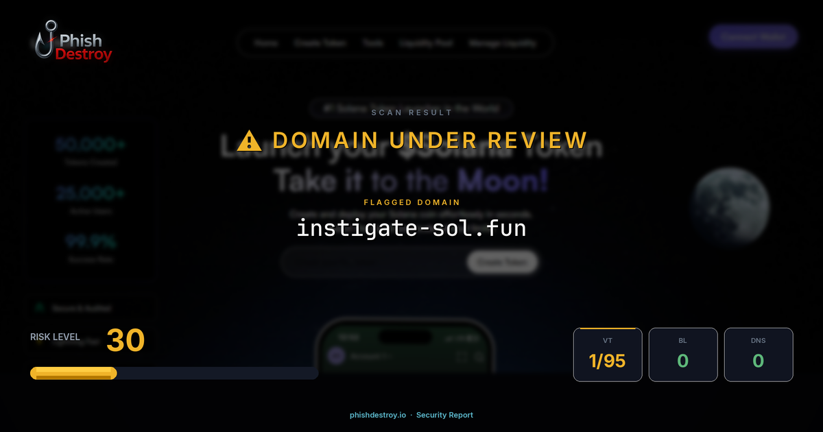 This domain security report for instigate-sol.fun is maintained by PhishDestroy's automated threat intelligence pipeline. Our system continuously monitors this domain across 1 security vendors on VirusTotal, 1 public blocklists.