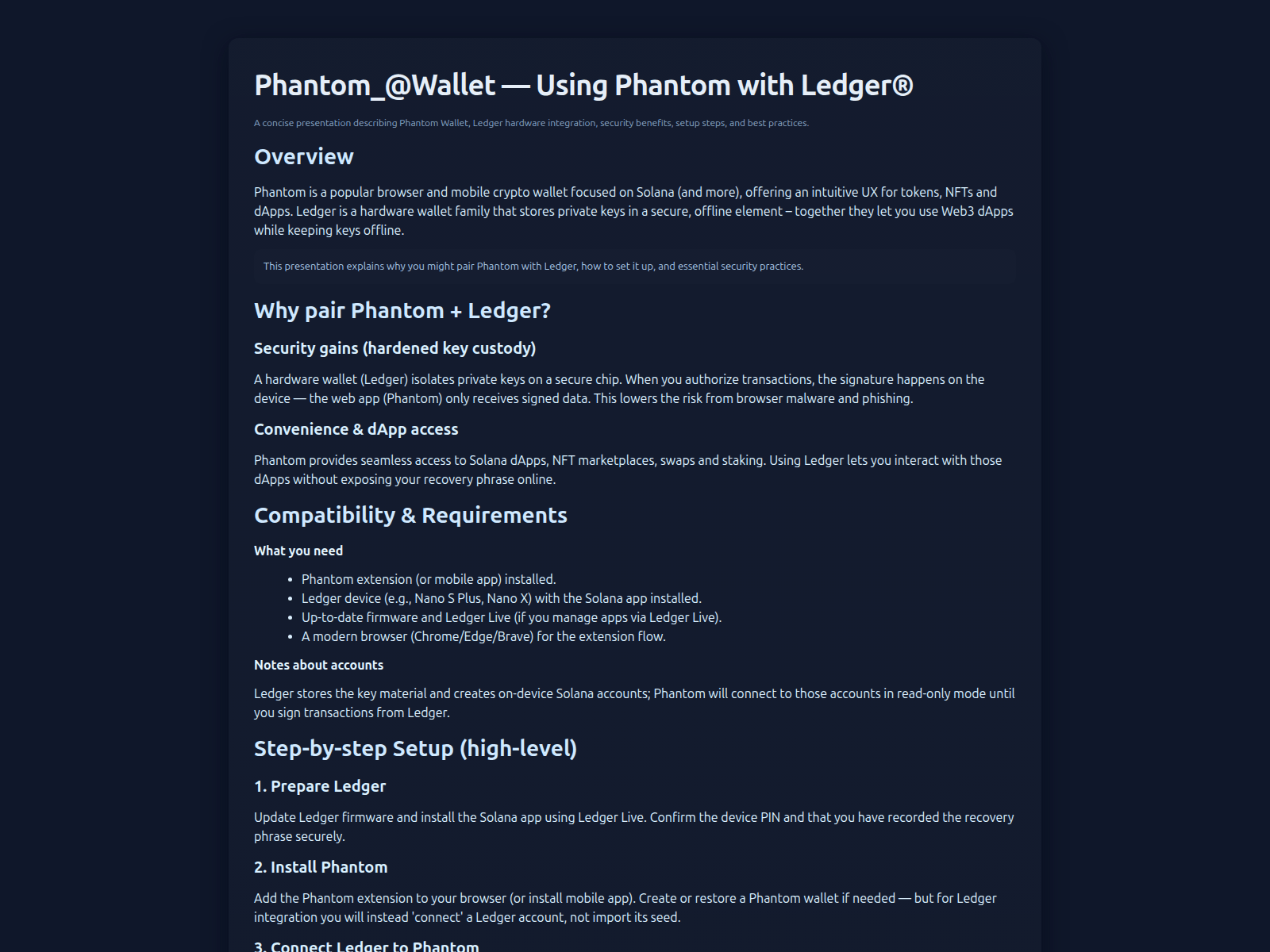 - Use a hardware wallet (Ledger, Trezor). Never store large amounts in browser wallets