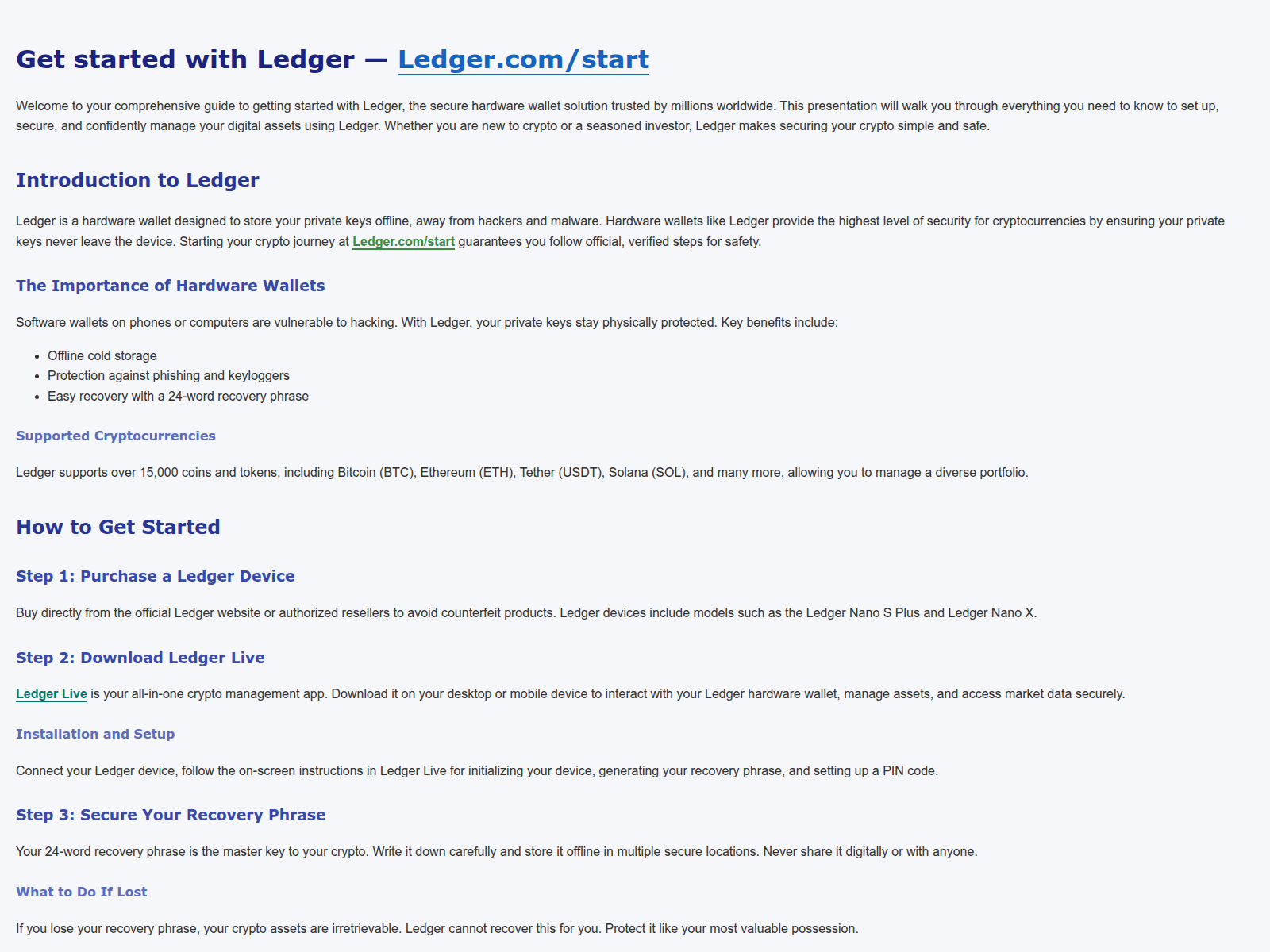 The site displays a page titled “Get started with Ledger — Ledger.com/start”, which may be designed to impersonate Ledger.