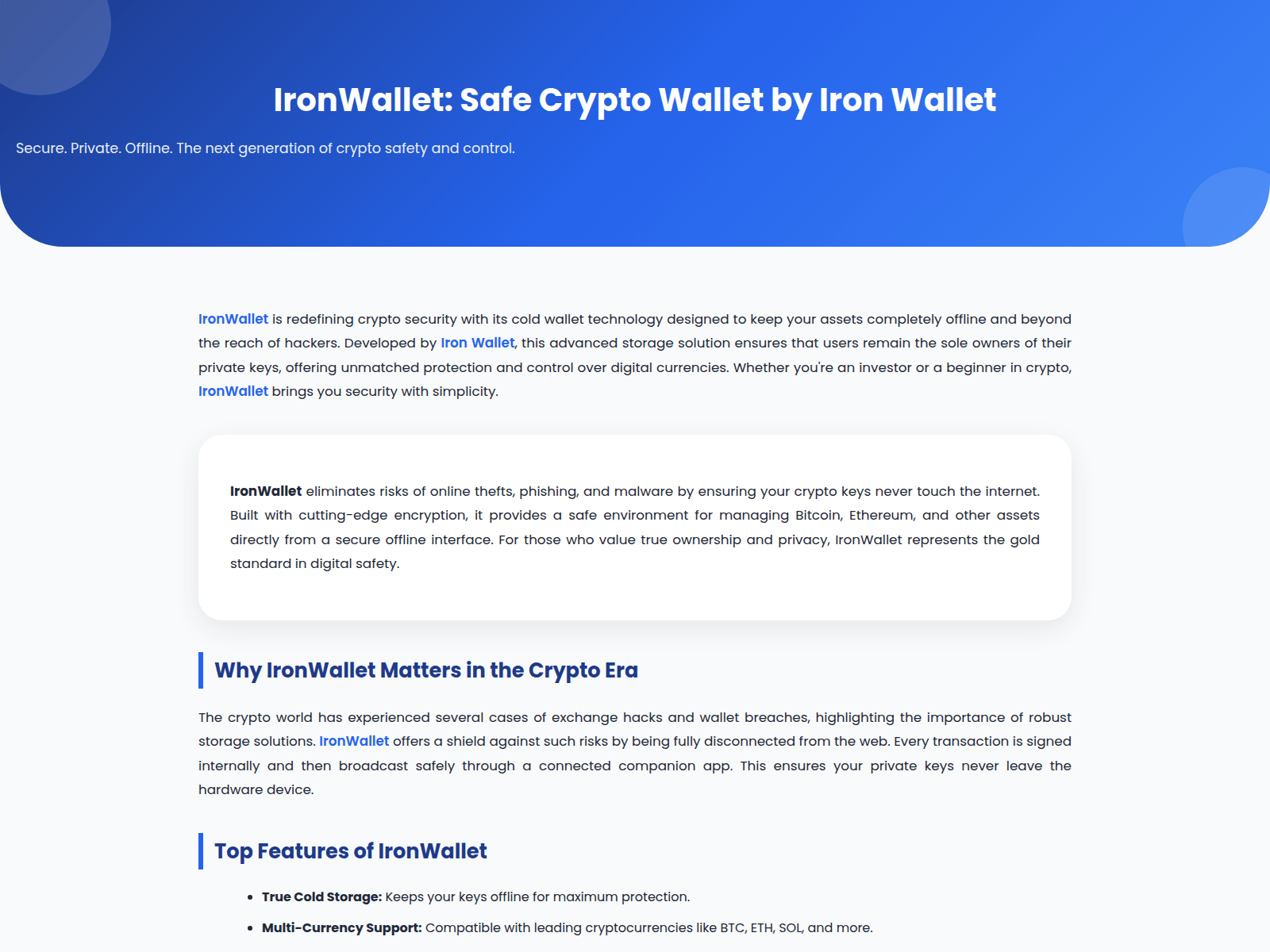The site displays a page titled “IronWallet: Safe Crypto Wallet by Iron Wallet”.