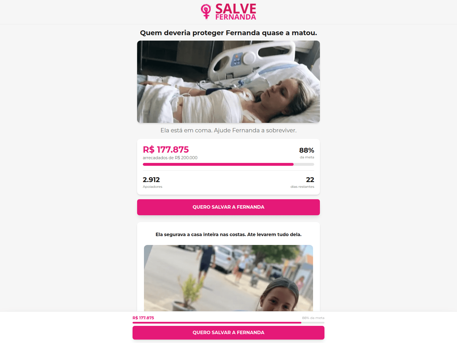 The site displays a page titled “Fernanda - Ajude a Salvar Essa Vida”.