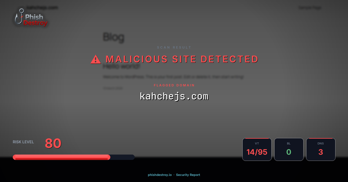 kahchejs.com has been flagged by 14 security vendors as of March 16, 2026.