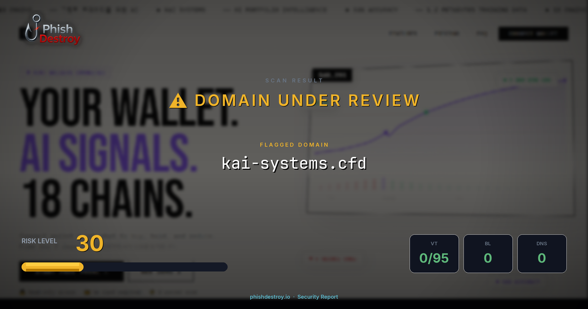 kai-systems.cfd has been listed on PhishDestroy as a suspicious domain. Scanned by 95 security vendors — automated detections may take time to update. PhishDestroy threat analysts continue to monitor this domain.