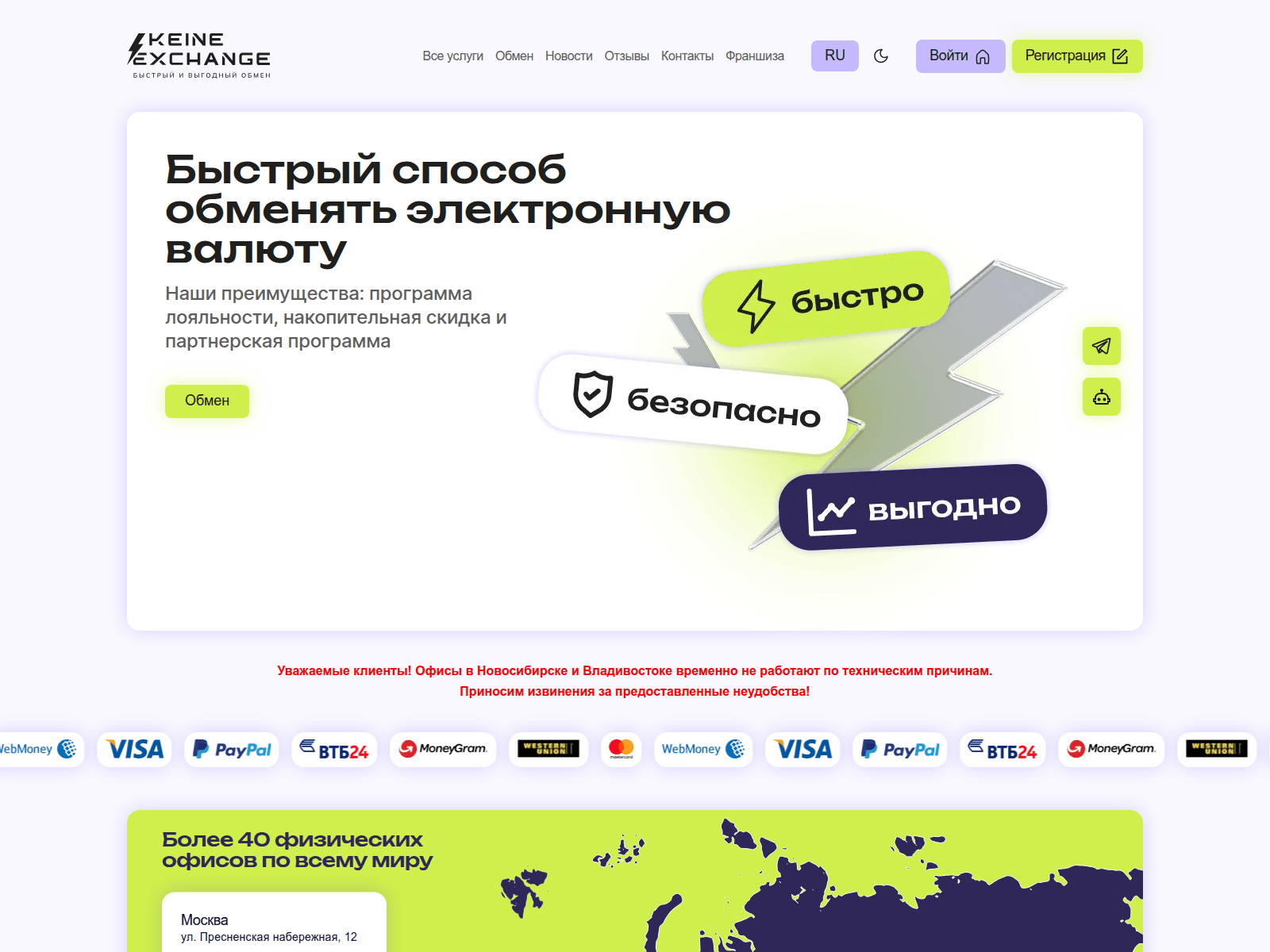 The site displays a page titled “Обменный пункт электронных валют”.