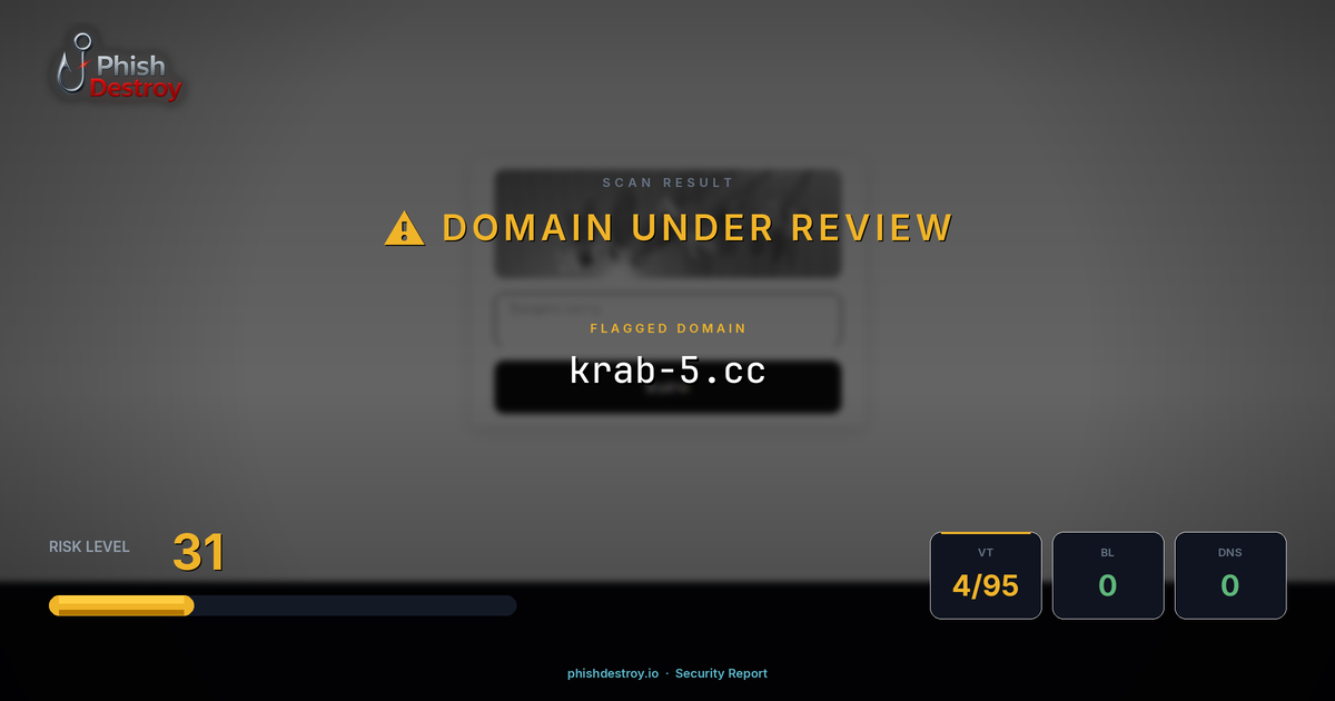 This domain security report for krab-5.cc is maintained by PhishDestroy's automated threat intelligence pipeline. Our system continuously monitors this domain across 4 security vendors on VirusTotal, 1 public blocklists.
