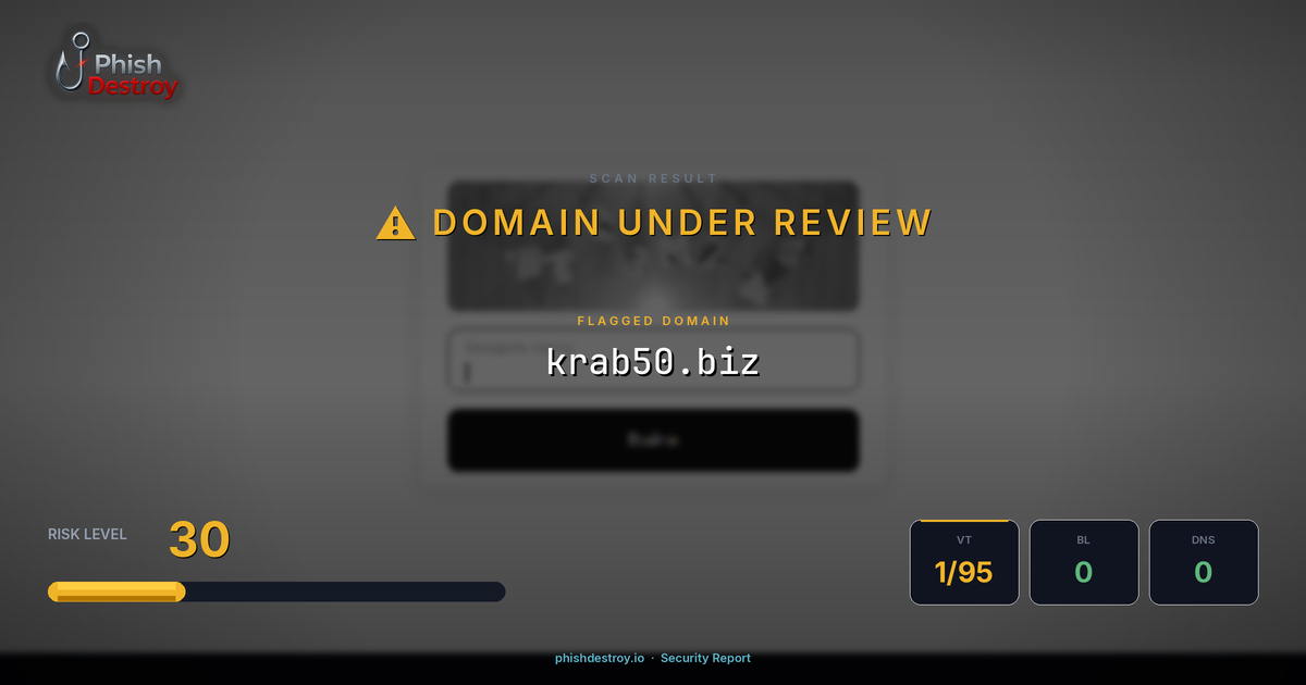 This domain security report for krab50.biz is maintained by PhishDestroy's automated threat intelligence pipeline. Our system continuously monitors this domain across 1 security vendors on VirusTotal, 1 public blocklists.