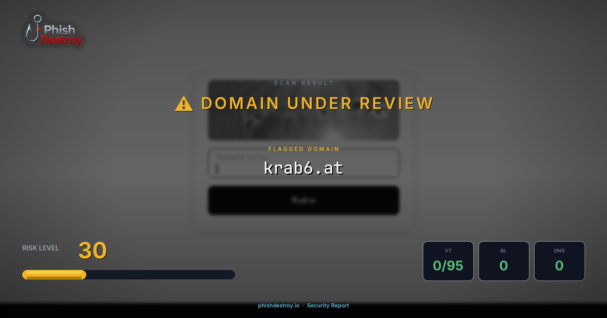 krab6.at has been listed on PhishDestroy as a suspicious domain. Scanned by 95 security vendors — automated detections may take time to update. PhishDestroy threat analysts continue to monitor this domain.