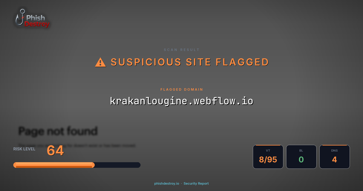 This domain security report for krakanlougine.webflow.io is maintained by PhishDestroy's automated threat intelligence pipeline. Our system continuously monitors this domain across 8 security vendors on VirusTotal, 1 public blocklists.