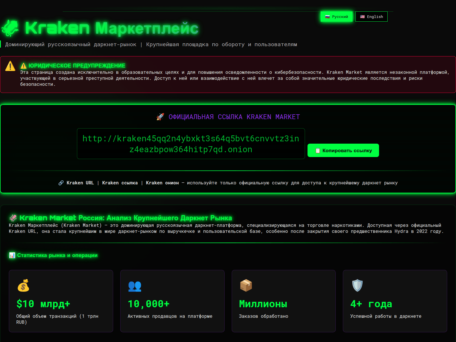 The site displays a page titled “Kraken ÐаÑкеÑÐ¿Ð»ÐµÐ¹Ñ | ÐÑакен ÐаÑÐºÐµÑ | ÐÑÑпнейÑий даÑÐºÐ½ÐµÑ Ñ...”, which may be designed to impersonate Kraken.