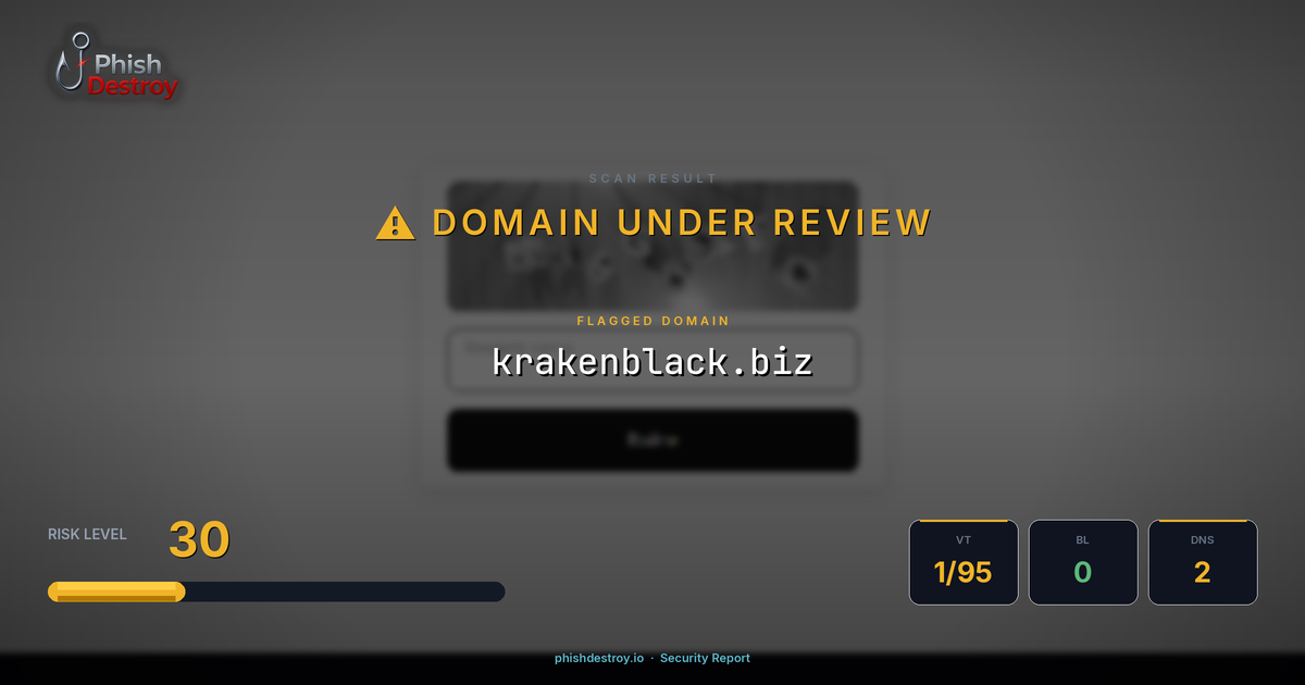 This domain security report for krakenblack.biz is maintained by PhishDestroy's automated threat intelligence pipeline. Our system continuously monitors this domain across 1 security vendors on VirusTotal, 1 public blocklists.
