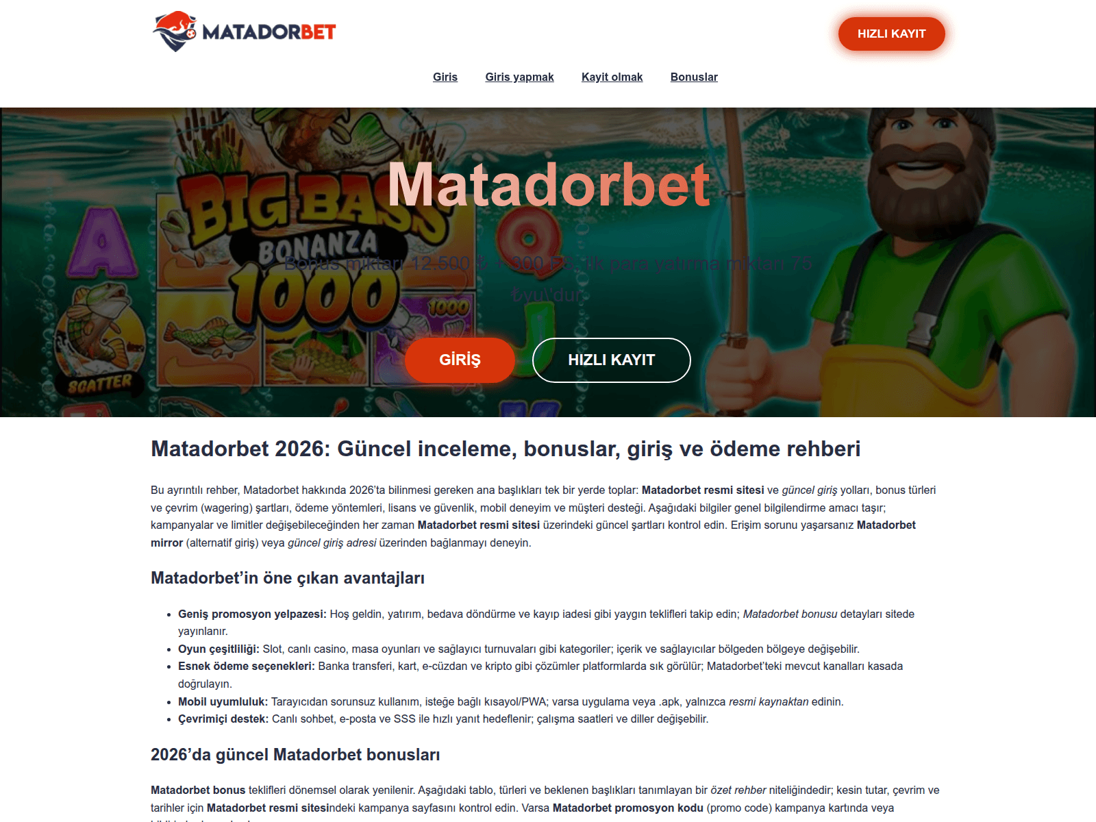 The site displays a page titled “Matadorbet 2026: Güncel Bonuslar, GiriÅ, Ãdeme ve İnceleme”.