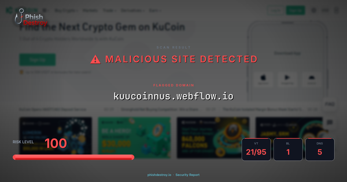 kuucoinnus.webflow.io has been flagged by 21 security vendors as of March 15, 2026.