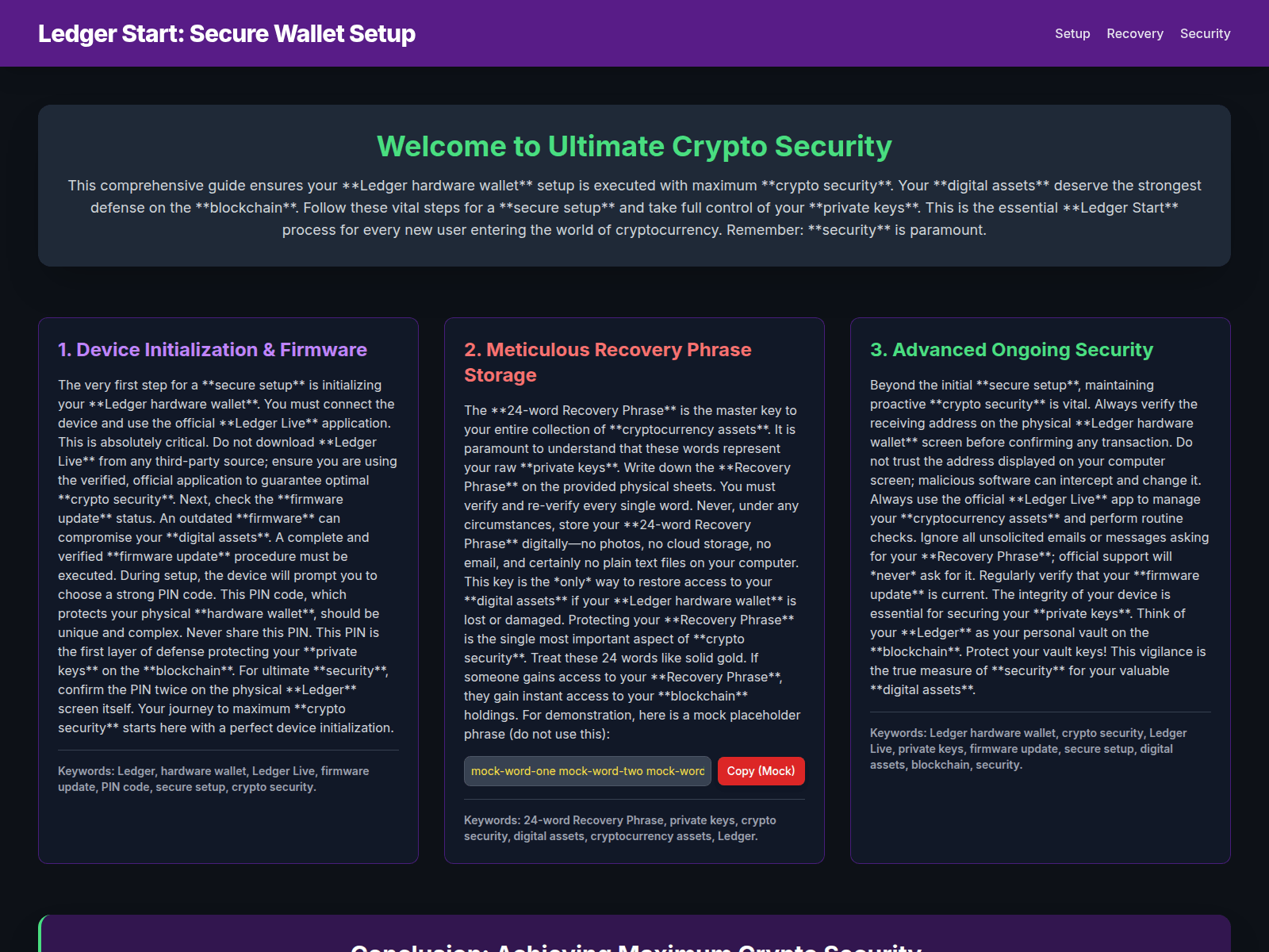 Always access Ledger through the official website. Never enter your seed phrase or private keys on any website. Use hardware wallets for additional security.