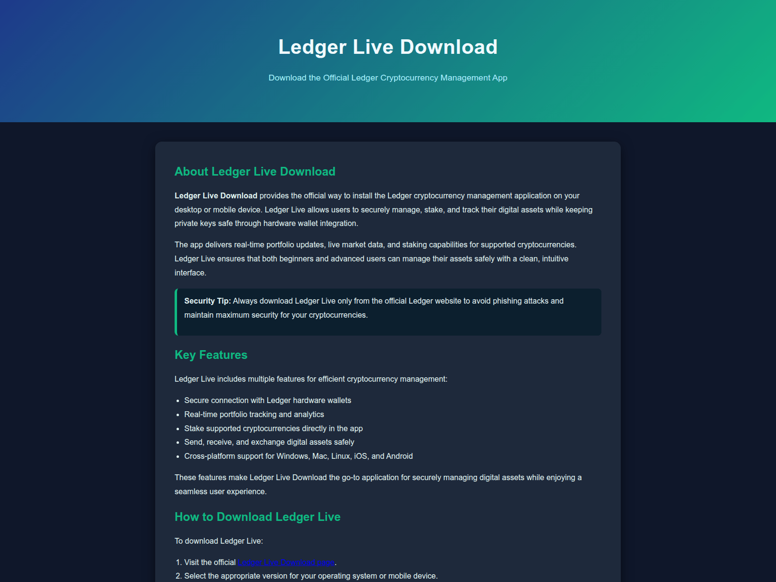 The site displays a page titled “Ledger Live Download - Secure Cryptocurrency App”, which may be designed to impersonate Ledger.