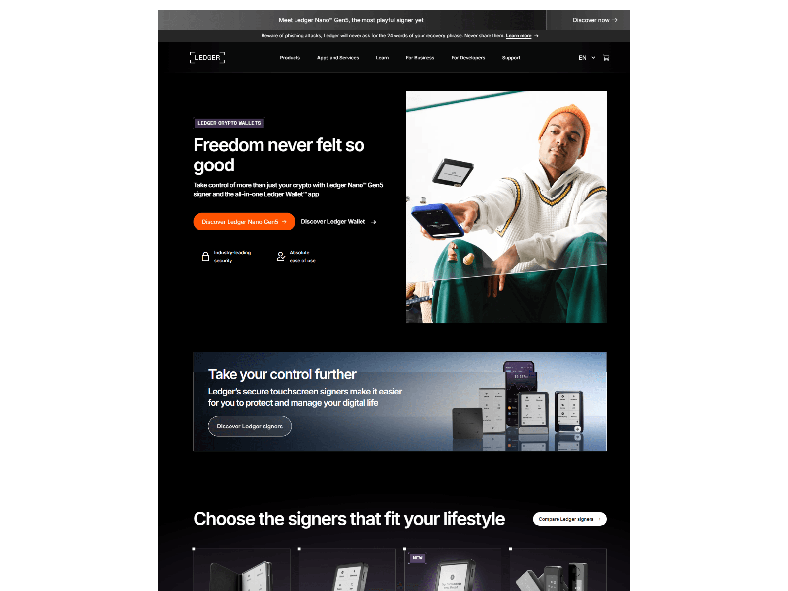 The site displays a page titled “Ledger Wallet | Secure Your Crypto Assets with Trusted Cold Storage”.