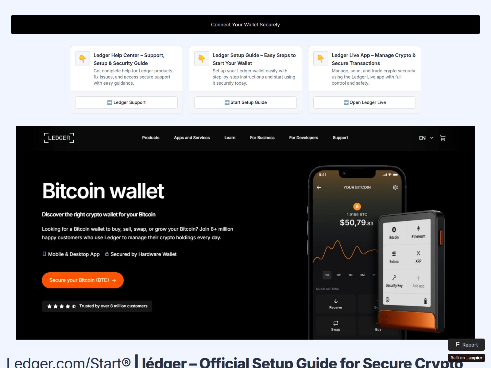 PhishDestroy identifies ledge-comstart[.]zapier[.]app as an elevated-risk domain actively impersonating Ledger, a leading cryptocurrency wallet provider. This threat falls under the category of a crypto drainer, designed to trick users into entering sensitive wallet credentials or transferring funds to attacker-controlled addresses under the guise of a legitimate Ledger setup page.