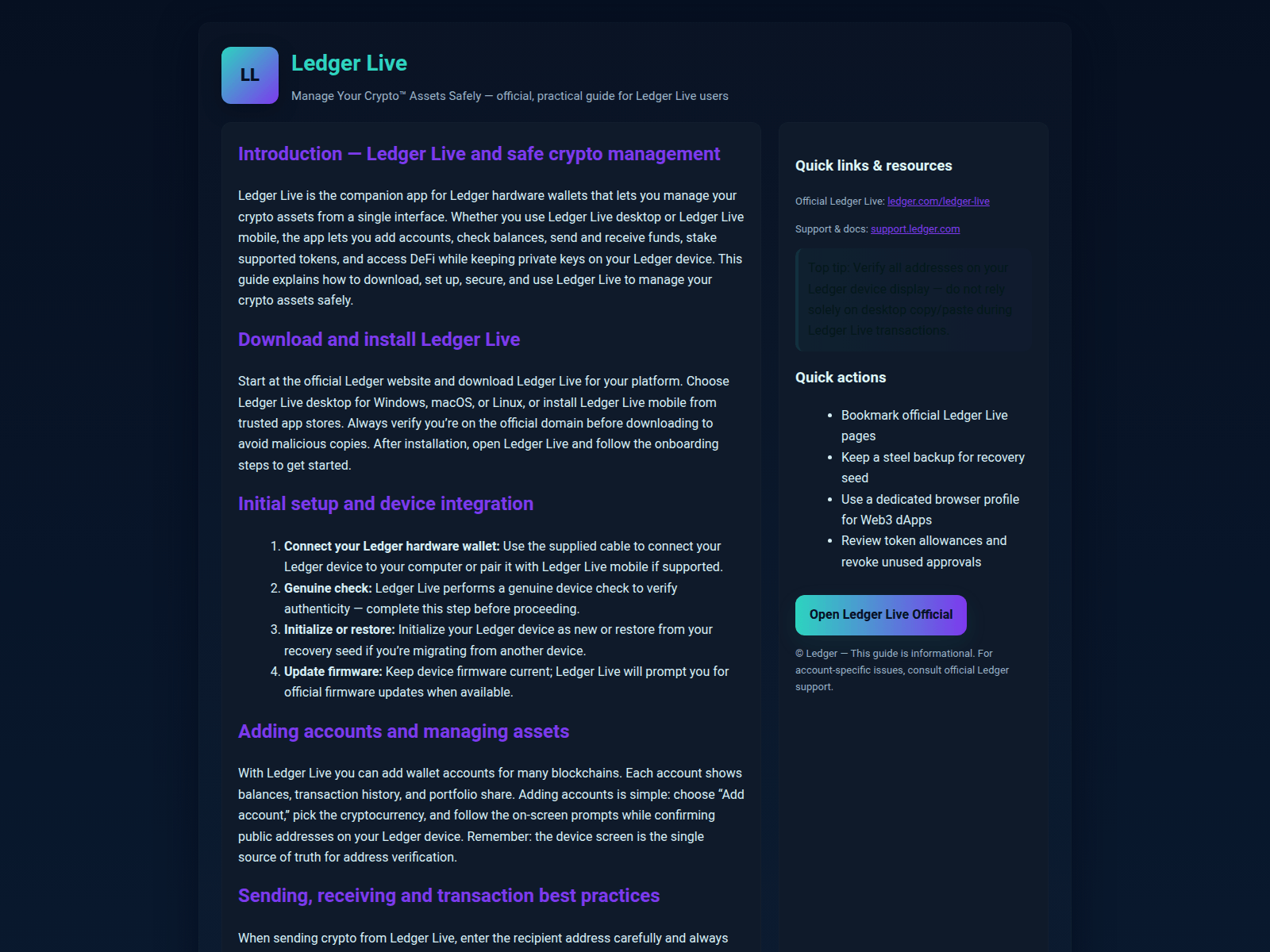 - Use a hardware wallet (Ledger, Trezor). Never store large amounts in browser wallets