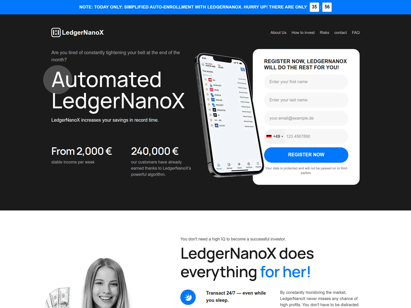 The site displays a page titled “LedgerNanoX – Automatic AI trading platform”, which may be designed to impersonate Ledger.