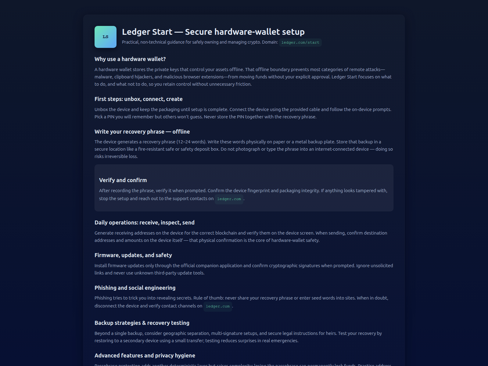 - Use a hardware wallet (Ledger, Trezor). Never store large amounts in browser wallets