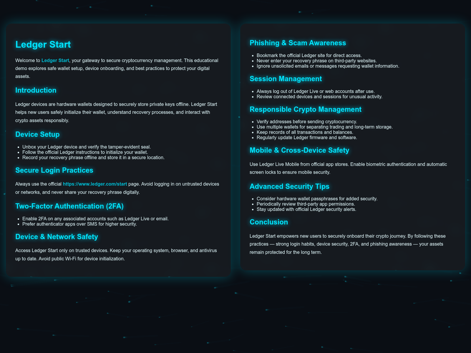 - Use a hardware wallet (Ledger, Trezor). Never store large amounts in browser wallets