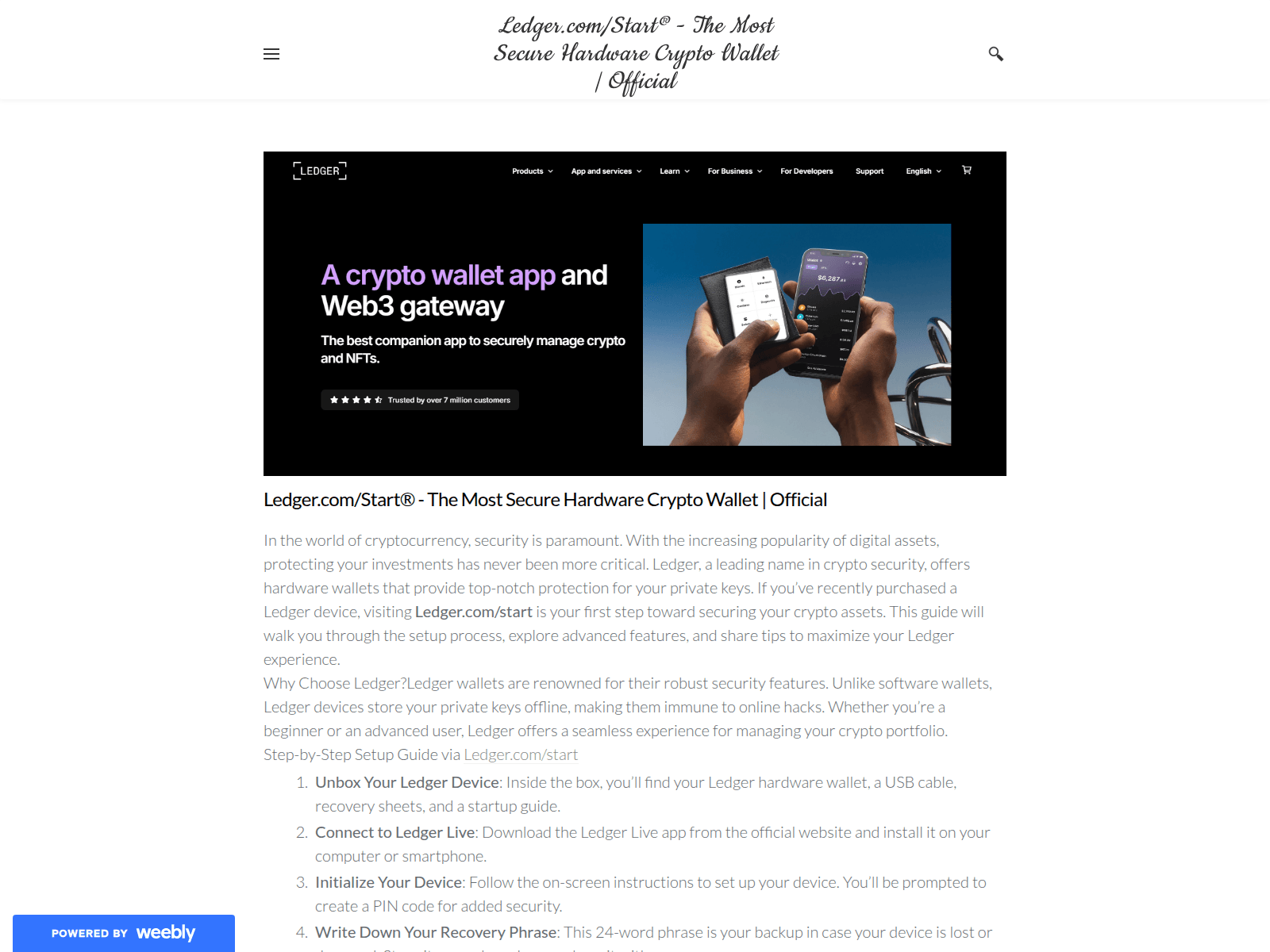 The domain ledgro-comstart[.]weebly[.]com has been identified as a cryptocurrency phishing website. This malicious site targets Web3 users by mimicking legitimate crypto platforms to steal wallet credentials and digital assets.