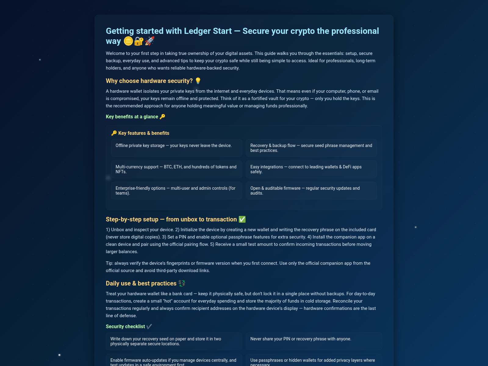 - Use a hardware wallet (Ledger, Trezor). Never store large amounts in browser wallets
