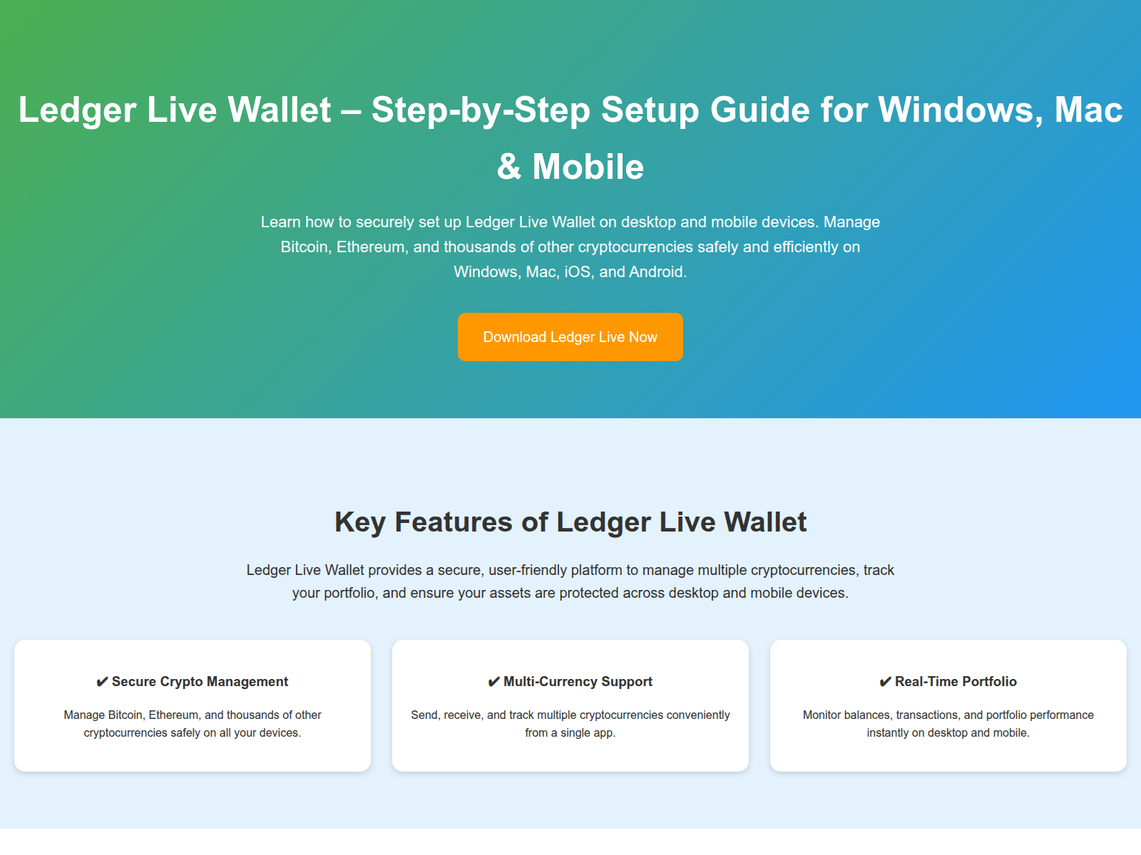 The site displays a page titled “Ledger Live Wallet – Step-by-Step Setup Guide for Windows, Mac”, which may be designed to impersonate Ledger.