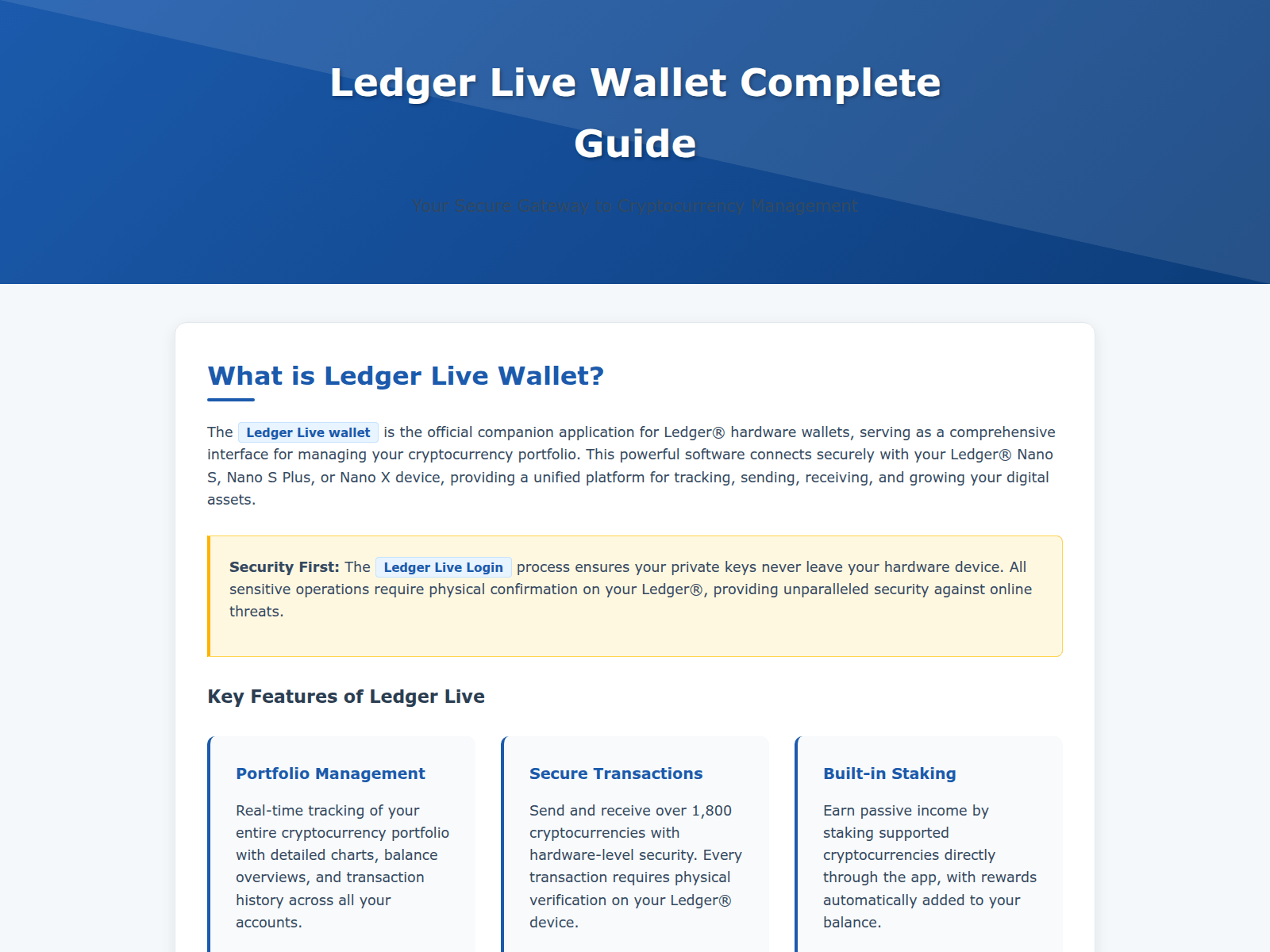 The site displays a page titled “Complete Guide to Ledger Live Wallet | Secure Crypto Management”, which may be designed to impersonate Ledger.