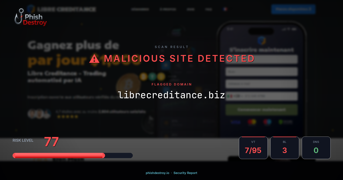 This domain security report for librecreditance.biz is maintained by PhishDestroy's automated threat intelligence pipeline. Our system continuously monitors this domain across 7 security vendors on VirusTotal, 2 public blocklists, and Google Safe Browsing.